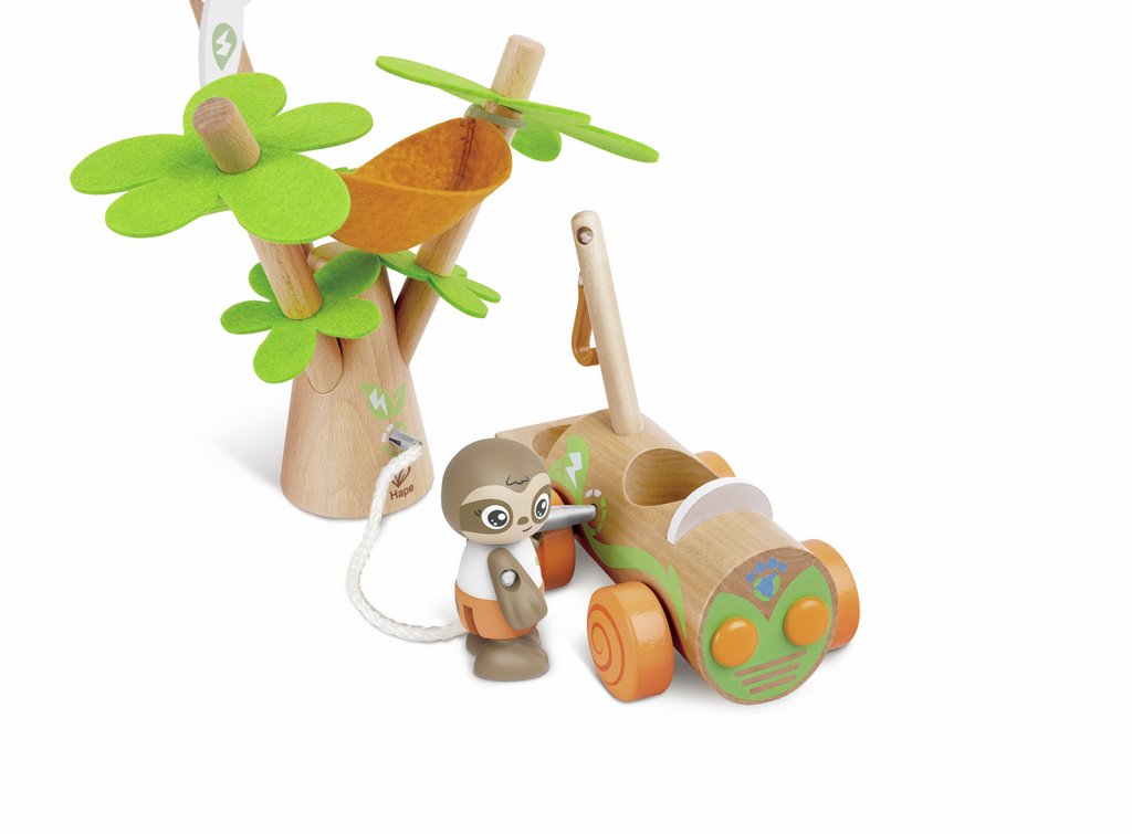 • The set includes 1 sloth figurine, a tree to plant, a shovel, a tree house with a hammock and charging port, a hose and a car with a crane feature.