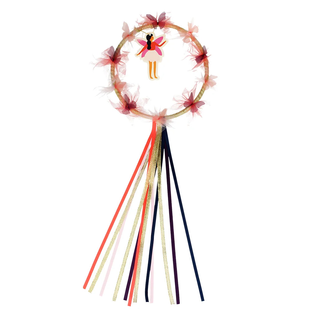 Pretty fairy garland crown for children, featuring a glittery headband, with butterfly and flower shaped pieces of tulle fabric and several colourful lengths of ribbon attached. A great accessory for fancy dress or role play.