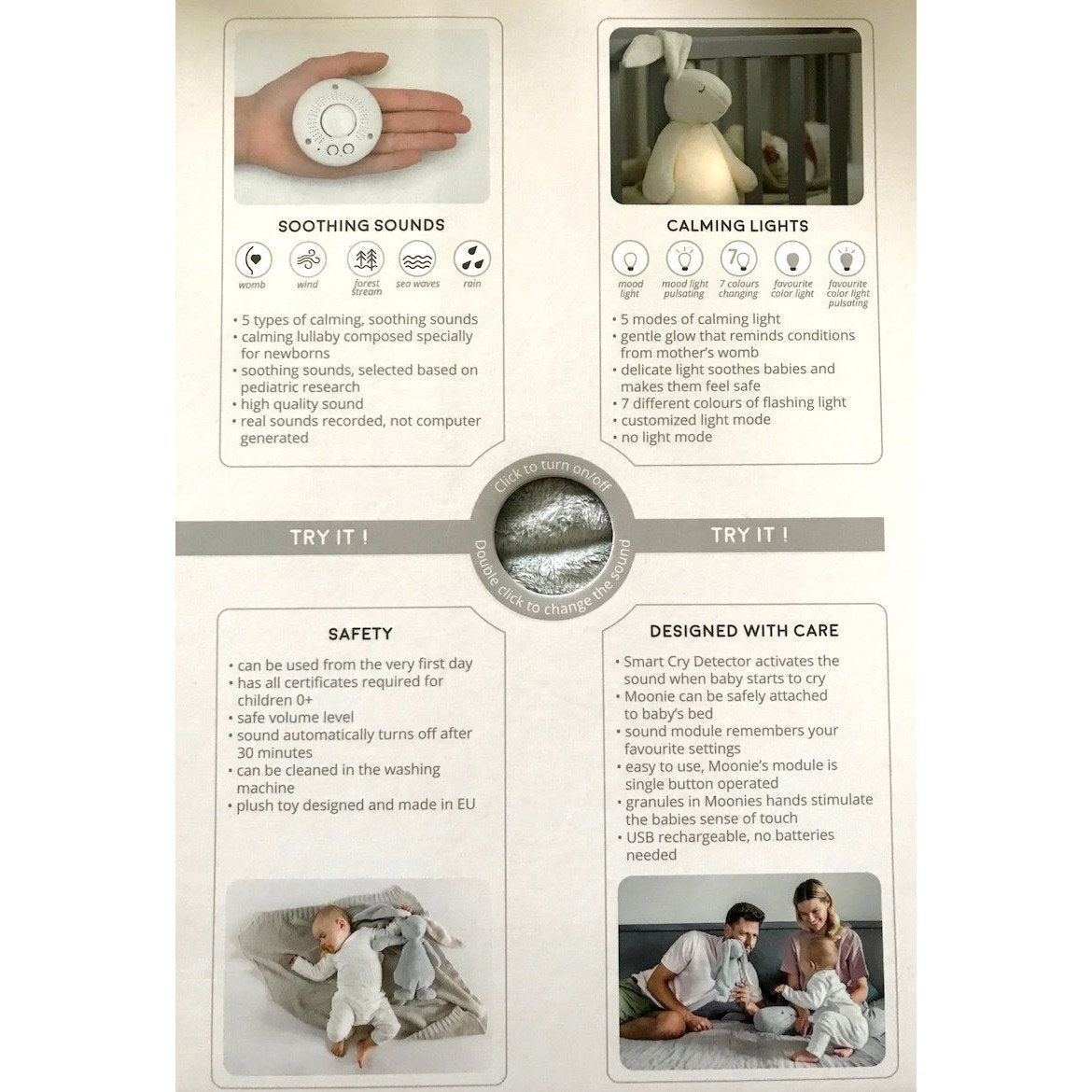 The Moonie 2.0 Powder Pink Rabbit is a soft, lightweight sleep companion designed to soothe babies with calming sounds and a gentle night light. With long ears that can be tied to a pram, stroller, or cot, this cuddly rabbit is perfect both at home and on the go.