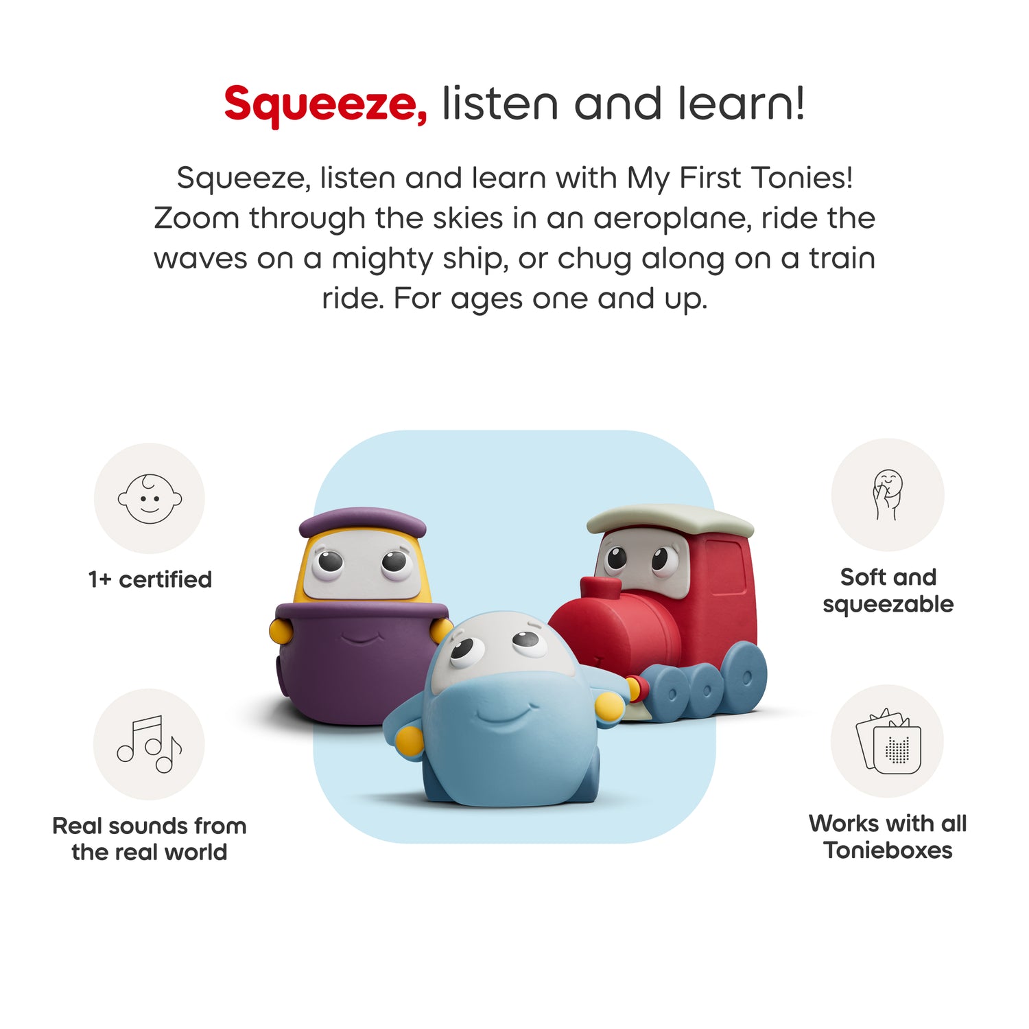 Set off on an adventure with My First Tonies! This set of three soft and squeezable Tonies— perfect for the littlest listeners aged one and over—invites children to soar in a plane, sail the seas or chug along on a train. Each Tonie features a short story, age-appropriate facts, a catchy original song and gentle sounds. Simply pop a Tonie on the Toniebox to spark curiosity, build vocabulary and inspire open-ended play through fun audio adventures.Good to know: